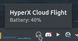 I’ve been using my wireless HyperX headphones for a while on Linux without any issue (just plug and play, insert the USB dongle and turn them on), but one thing has been bothering me: not knowing how much battery I have left. Normally on Windows you can check it via their Ngenuity app but it is not supported on Linux. Luckily someone already made a small tray application just for that. Note that this one only supports the Cloud Flight headset, but there is another one that supports the Cloud II Wireless and Cloud Stinger 2 headsets.